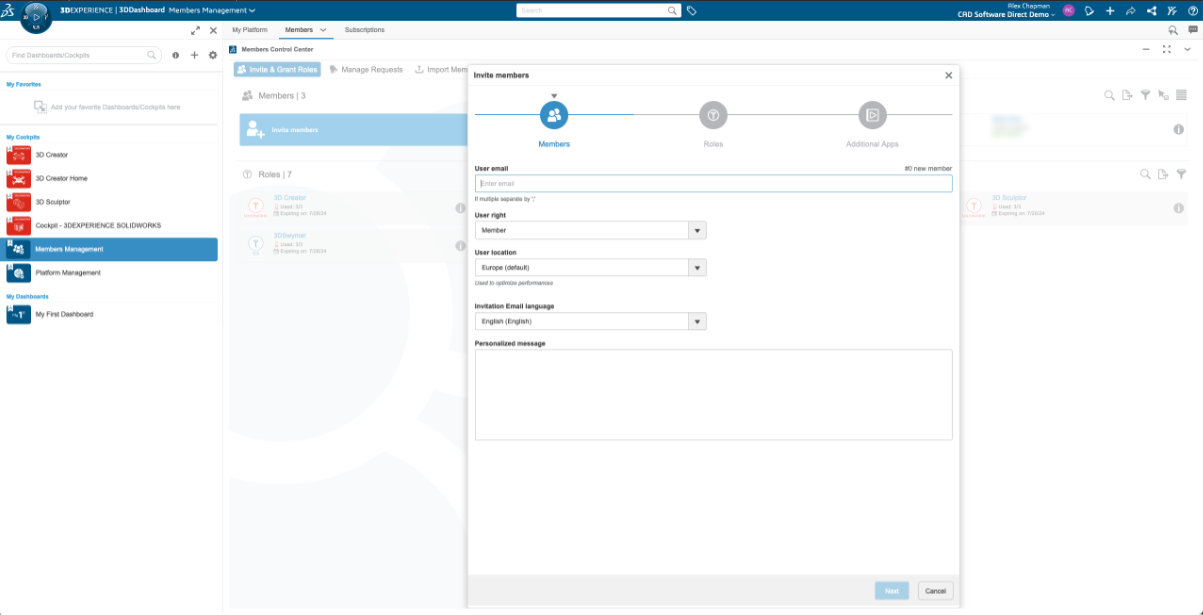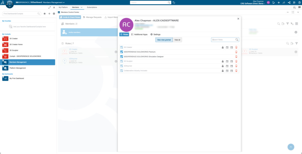 The Members Management is an app on 3DEXPERIENCE that provides users with Administrator rights access to manage the users and their assigned roles on the platform. You can think of a role like a license; a set of software capabilities assigned to a given user.